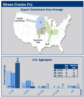 - In 2015, there was a much greater percentage of samples with less than 10% stress cracks (93.2%) compared to 2014 (79%) and 2013 (80%). Also in 2015, 3.1% of the samples had stress cracks above 20%, which is fewer than in 2014 (9%) and 2013 (11%).