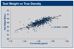 - Test weight, also known as bulk density, is based on the amount of mass that can be packed into a quart cup. While test weight is influenced by true density as shown in the adjacent figure (a correlation coefficient of 0.78), it is also affected by moisture content, pericarp damage (whole kernels), breakage and other factors. In 2015, test weight was 58.2 lb/bu, which was higher than 57.6 lb/bu and 57.9 lb/bu found in 2014 and 2013, respectively. The 2015 test weight likely remained high, in spite of low true density, due to lower moistures, high percentages of whole kernels and low breakage.