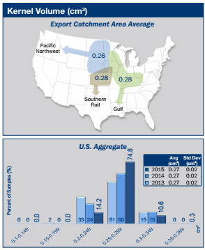 - Average kernel volume (0.27 cm3) for the U.S. Aggregate in 2015 was the same as 2014, 2013 and 4YA. However, the distribution indicates there was a higher percentage of large kernels in 2015 compared to the previous two years.