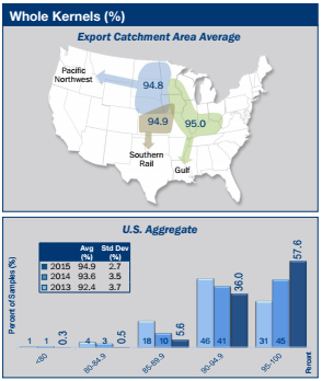 - Whole kernels averaged 94.9% for U.S. Aggregate corn in 2015, higher than 2014 (93.6%), 2013 (92.4%), and 4YA (93.5%).