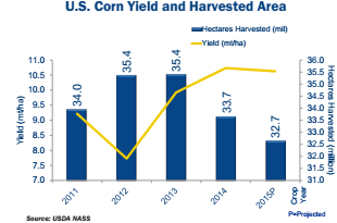 - While 2015 saw the lowest number of harvested hectares since 2009, the 2015 crop experienced the second-highest average yield on record, thereby producing the third-largest U.S. corn crop on record.