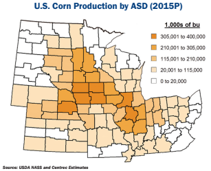 The geographic areas included in the Harvest Report encompass the highest corn-producing areas in the United States. This can be seen on the map showing projected 2015 corn production by USDA Agricultural Statistical District (ASD).