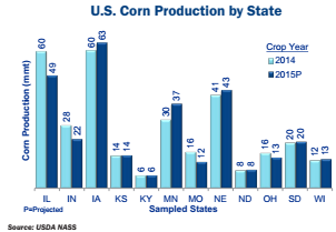 Relative to the record corn crop produced in 2014, the slightly reduced size of the 2015 crop was primarily driven by lower production in Illinois, Indiana, Missouri, and Ohio compared to 2014. Of the remaining eight states, five states produced about the same amount of corn in 2015 as in 2014, and three states had greater production in 2015 than in 2014 (Iowa, Minnesota and Nebraska).