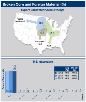- Average U.S. Aggregate broken corn and foreign material (BCFM) (0.8% consisting primarily of broken corn) was the same as in 2014, less than in 2013 and 4YA, and well below the maximum for U.S. No. 1 grade. Low BCFM indicates minimal cleaning required for corn delivered to first handler and should facilitate good aeration during storage.