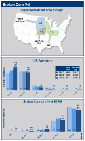 - Broken corn in the U.S. Aggregate samples averaged 0.6% in 2015, the same as 2014, and slightly lower than 2013 (0.7%) and 4YA (0.7%).