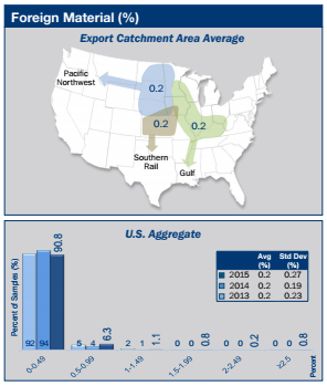 - In the 2015 crop, 90.8% of the samples contained less than 0.5% foreign material, fewer than in 2014 (94%) and 2013 (92%).