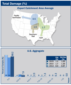 - Average U.S. Aggregate total damage (1.4%) was lower than 2014 (1.7%), but higher than 2013 (0.9%) and 4YA (1.1%). Although higher than 4YA, 2015 total damage was still well below the limit for U.S. No. 1 grade (3%).