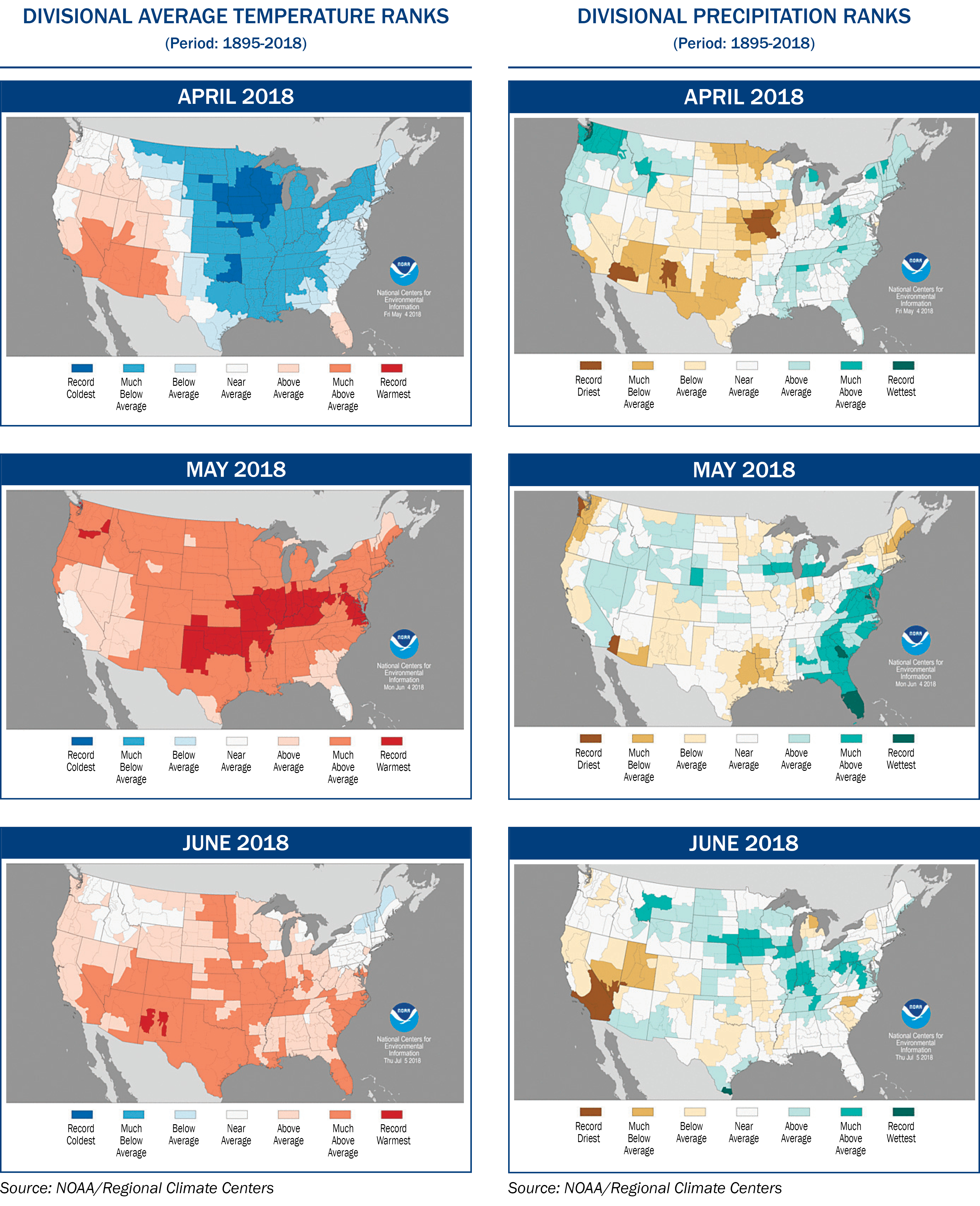 In the Pacific Northwest ECA in May, the northern areas were drought-stressed, while southern areas of this ECA, such as Nebraska, were much wetter than normal, leading to plant stress. June continued warm and wet, quickly advancing plant development, but also promoting leaf diseases.