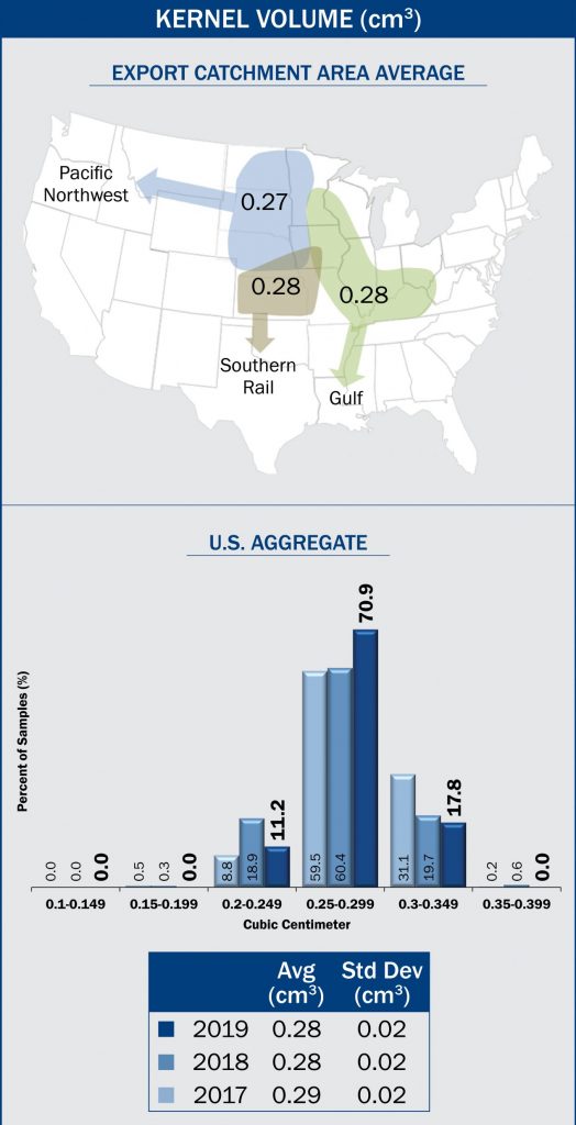 U.S. Aggregate kernel volume averaged 0.28 cm3 in 2019, same as 2018 and 5YA, but lower than 2017 (0.29 cm3).- Kernel volume variability was constant across the years. The standard deviation for U.S. Aggregate kernel volume was 0.02 cm3 for 2019, 2018, 2017 and the 5YA.