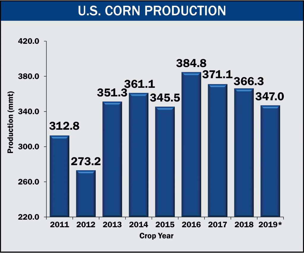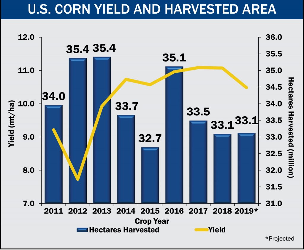 Average U.S. corn yield and harvested hectares are both projected to be lower than the average of the previous five crops. Average projected corn yield in 2019 is projected to be 10.48 metric tons per hectare (167.0 bushels per acre) compared to the 5YA of 10.89 metric tons per hectare (173.4 bushels per acre). In terms of harvested hectares, the projected 33.12 million (81.8 million acres) harvested is also slightly less than the 5YA of 33.61 million hectares (83.0 million acres).