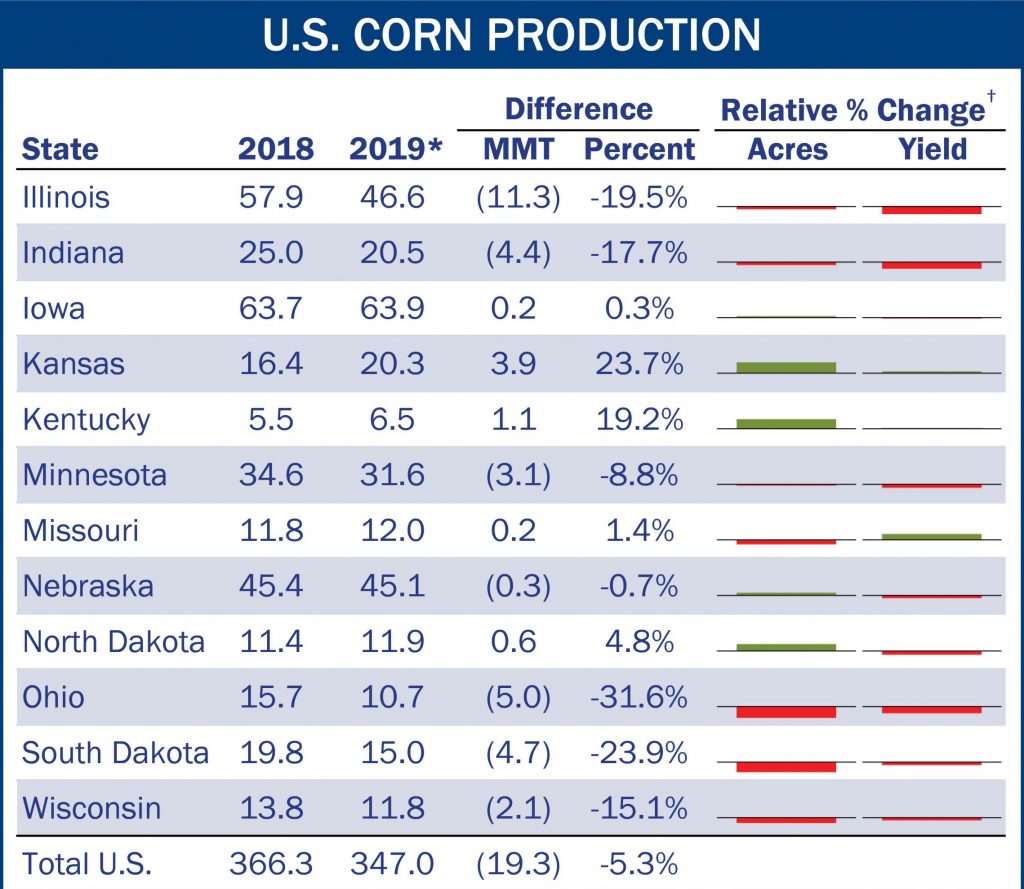 The U.S. Corn Production by State chart and table summarize the changes in production between each state’s 2018 and projected 2019 corn crops. The table also includes an indication of the relative changes in harvested acres and yield. A green bar indicates a relative increase, and a red bar indicates a relative decrease from 2018 to projected 2019. Eight of the 12 key corn-producing states expect large changes (greater than 10.0%) in production relative to their 2018 crops.