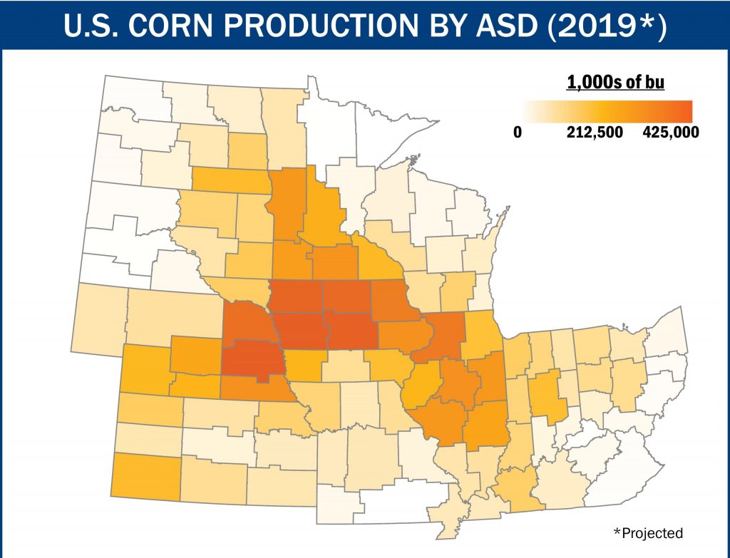 The geographic areas included in the 2019/2020 Corn Harvest Quality Report encompass the highest corn-producing regions of the United States. The map shows the projected 2019 corn production by USDA Agricultural Statistical District (ASD). These states represent over 90.0% of U.S. corn exports.