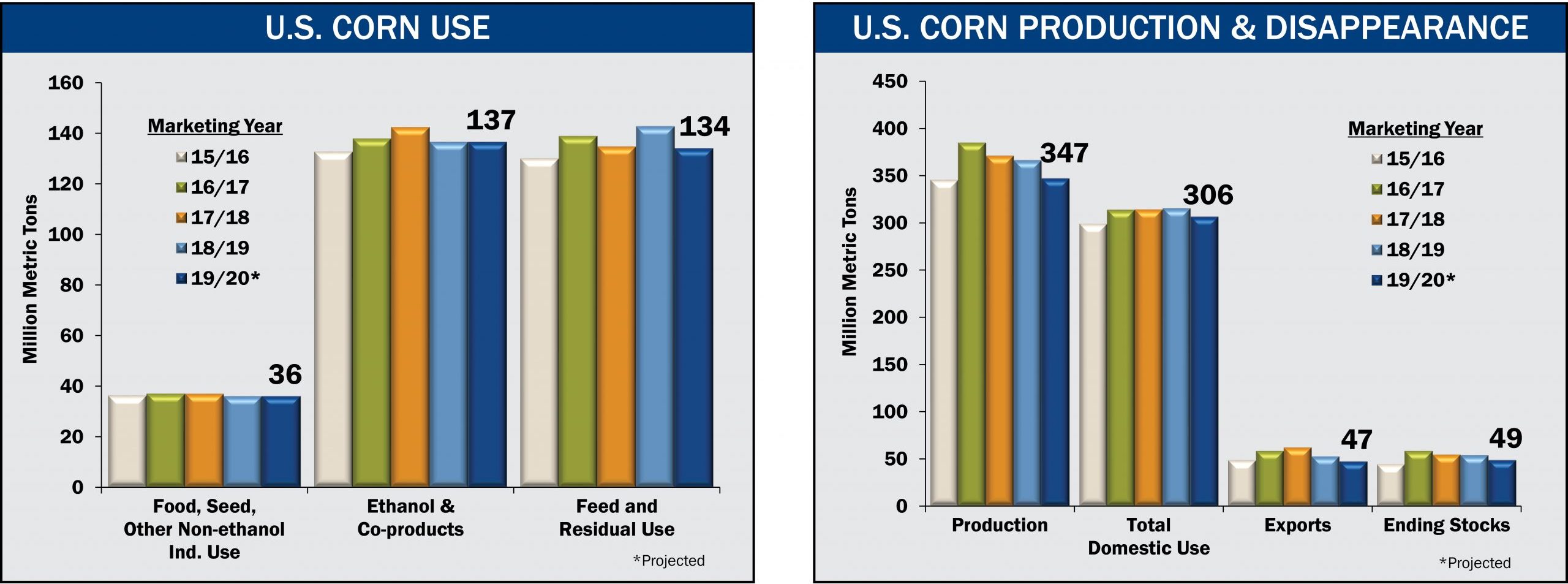 Lower U.S. corn exports are also projected for marketing year 19/20 as a result of the smaller corn crop anticipated. U.S. corn exports are projected to be 46.99 million metric tons in marketing year 19/20, which is a decrease of 5.46 million metric tons (10.4% decrease) from marketing year 18/19.