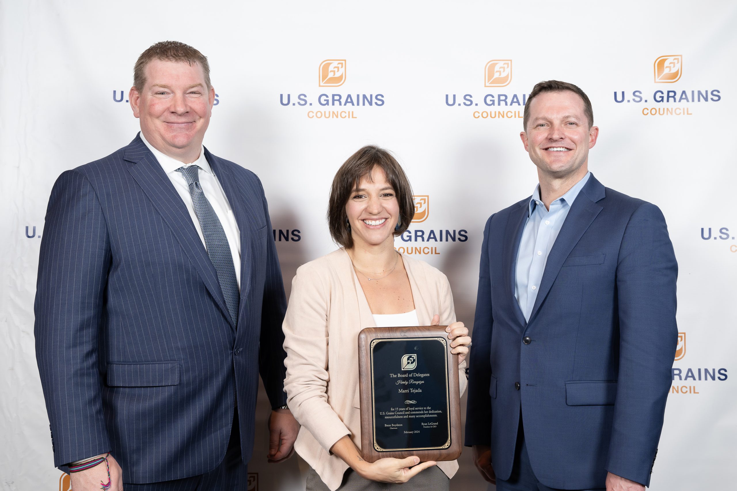 The U.S. Grains Council (USGC) recognized USGC Regional Director in Latin America Marri Tejada for her 15 years of service to the organization at its 21st International Marketing Conference and 64th Annual Membership Meeting in Guatemala City, Guatemala, held Feb. 14-16.