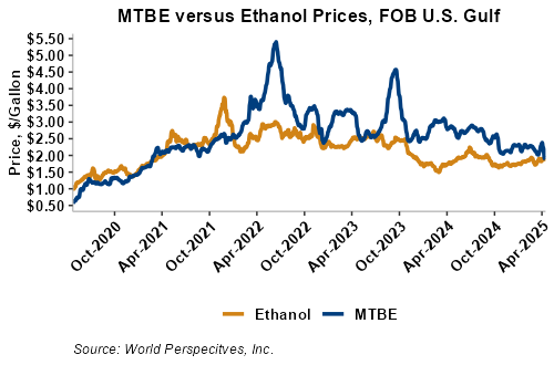 MTBE prices fell 12.9 percent last week and extended that selloff in early week trading to fall 7 percent from Friday’s close through Tuesday’s trading. MTBE’s premium to FOB Houston ethanol has decreased from last week’s report and stands at -0.06 cents/liter (-0.23 cents/gallon).