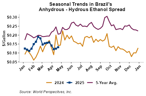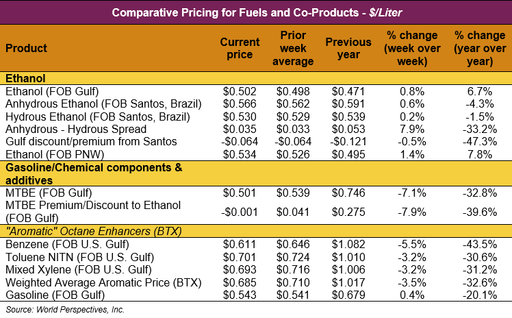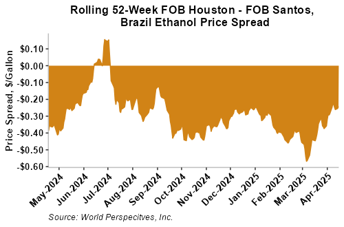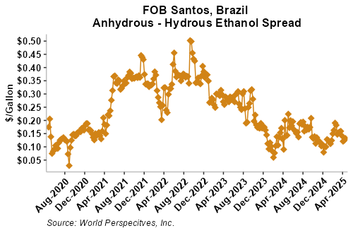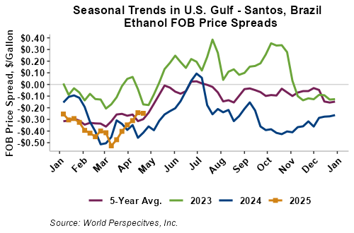The FOB Gulf-Santos, Brazil ethanol spread has narrowed from last week’s close through Tuesday’s trading and is currently at -6.37 cents/liter (-24.12 cents/gallon).