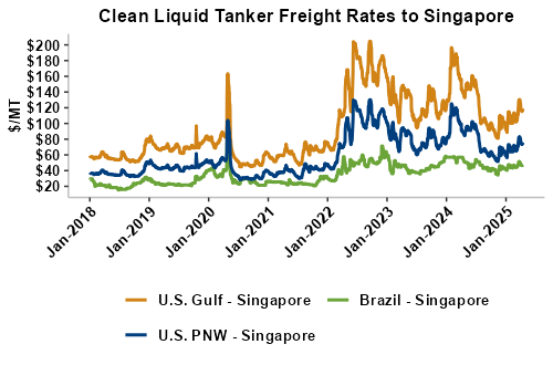 Liquid tanker rates are 2 percent higher on average this week with offers for the U.S. Gulf to South Korea seeing the largest gains (up 3 percent). Freight from the U.S. Gulf to the West Coast of Central America saw the largest declines and is down 1 percent from last week. On average, tanker freight from the U.S. Gulf is up 2 percent this week while freight from the PNW has posted a 3 percent increase. Liquid tanker freight rates from Brazil are up 2 percent, on average, this week. Freight rates across all origins are 13 percent lower than this same week in 2024.