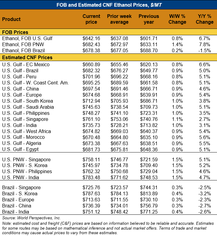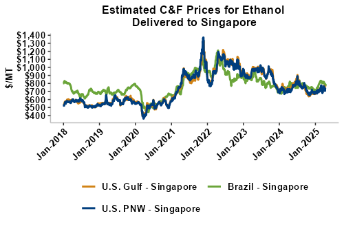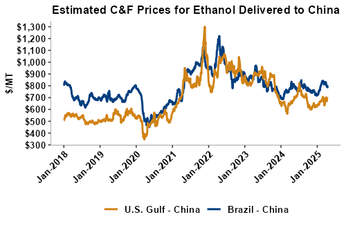 On a cost-and-freight (C&F) basis, offers are mostly higher this week as both freight rates and FOB ethanol offers have climbed higher. Prices for ethanol C&F to Central America from the U.S. Gulf are up 0.8 percent this week and are up 5.6 percent from this same week in 2024. Values for PNW ethanol to Southeast Asia average $755.47/MT this week, up 1.5 percent from the prior week and up 4.9 percent year-over-year. That compares to U.S. Gulf to Southeast Asia C&F prices that average $740.77/MT and are up 1 percent from last week and are up 3.3 percent year-over-year. C&F prices for Brazilian ethanol to Southeast Asia are up 0.3 percent from last week.