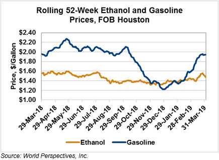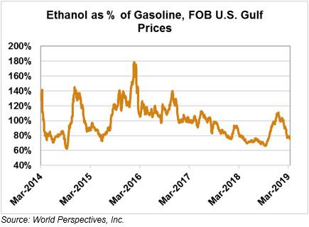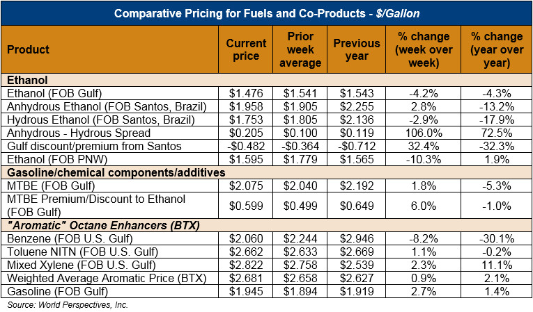 Market Outlook: U.S. ethanol prices ended last week down 4.5 percent and continue down (-1.3 percent) in early week trading. Midwest wholesale rack ethanol prices were unchanged to end last week; they are down to start this week at 39.52 cents/liter (149.59 cents/gallon) through Tuesday’s trading.