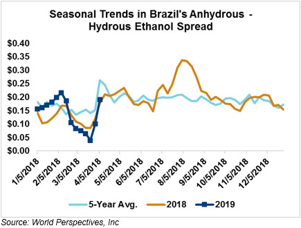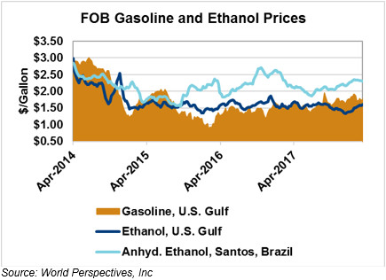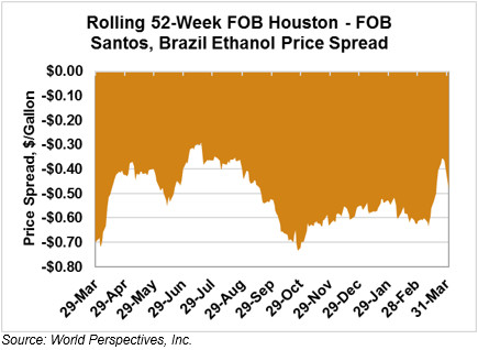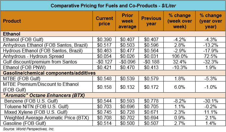 The FOB Gulf-Santos, Brazil spread widened from last week’s close through Tuesday’s trading and is currently at -12.73 cents/liter (-48.21 cents/gallon).