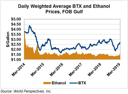 BTX component prices were up across the board to end last week but are mixed through Tuesday’s trading: Benzene is down 7.4 percent, Toluene is up 0.9 percent and Xylene is up 2.6 percent. The estimated weighted average aromatic price is currently 70.95 cents/liter (268.58 cents/gallon), up 1.1 percent from last Friday’s close. The BTX-Houston ethanol spread widened from last week; the weighted average BTX price is 31.96 cents/liter (120.99 cents/gallon) higher than the FOB Houston ethanol price.