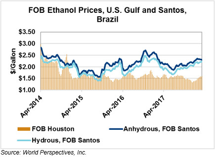 FOB Houston ethanol prices finished last week up 2.5 percent; prices have since fallen and are down 4.2 percent through Tuesday’s trading from Friday’s close. FOB Houston ethanol prices are quoted at 38.98 cents/liter (147.58 cents/gallon). FOB Santos, Brazil ethanol prices ended last week down 4 percent; they are up from Friday’s close and stand at 51.72 cents/liter (195.80 cents/gallon) through Tuesday’s trading.