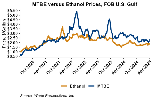 MTBE prices rose 8.8 percent last week and extended that rally in early week trading to gain 5.7 percent from Friday’s close through Tuesday’s trading. MTBE’s premium to FOB Houston ethanol has increased from last week’s report and stands at 13.1 cents/liter (49.6 cents/gallon).