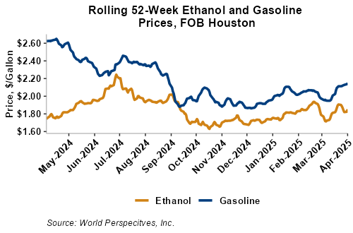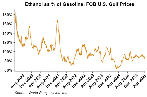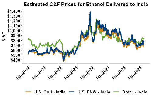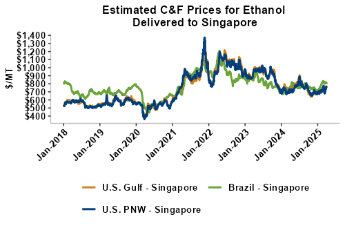 On a cost-and-freight (C&F) basis, offers are mostly lower this week as lower liquid tanker freight rates have offset slight gains in FOB ethanol offers. Prices for ethanol C&F to Central America from the U.S. Gulf are down 0.7 percent this week and are up 5.2 percent from this same week in 2024. Values for PNW ethanol to Southeast Asia average $737.38/MT this week, up 0.8 percent from the prior week and up 5.5 percent year-over-year. That compares to U.S. Gulf to Southeast Asia C&F prices that average $726.83/MT and are down 1.3 percent from last week but are up 4.4 percent year-over-year. C&F prices for Brazilian ethanol to Southeast Asia are down 0.9 percent from last week.