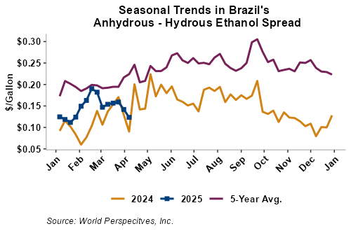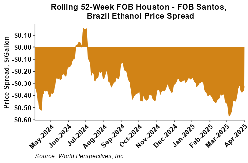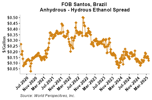 The FOB Gulf-Santos, Brazil ethanol spread has narrowed from last week’s close through Tuesday’s trading and is currently at -8.47 cents/liter (-32.06 cents/gallon).