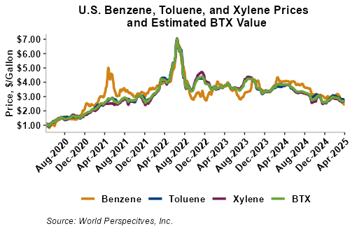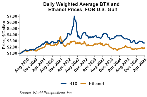 BTX component prices were mixed last week and continued that trend through Tuesday’s market close: Benzene was down 0.9 percent while Toluene was up 0 percent, and Xylene was up 2.7 percent. The estimated weighted average aromatic price is currently 71.88 cents/liter (272.1 cents/gallon), up from last Friday’s close. The BTX-Houston ethanol spread widened last week, and the weighted average BTX price is 22.96 cents/liter (86.93 cents/gallon) higher than the FOB Houston ethanol price.