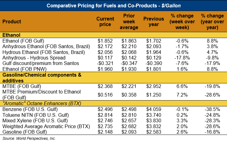 Market Outlook: U.S. ethanol prices ended last week 4.5 percent lower but reversed those losses in early week trading and rose 4.7 percent through Tuesday’s close. Midwest wholesale rack ethanol prices were lower to end last week but were up 1.1 percent through Tuesday’s market close to their last quote of 49.87 cents/liter (188.77 cents/gallon).