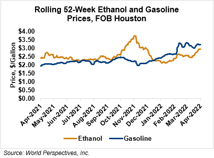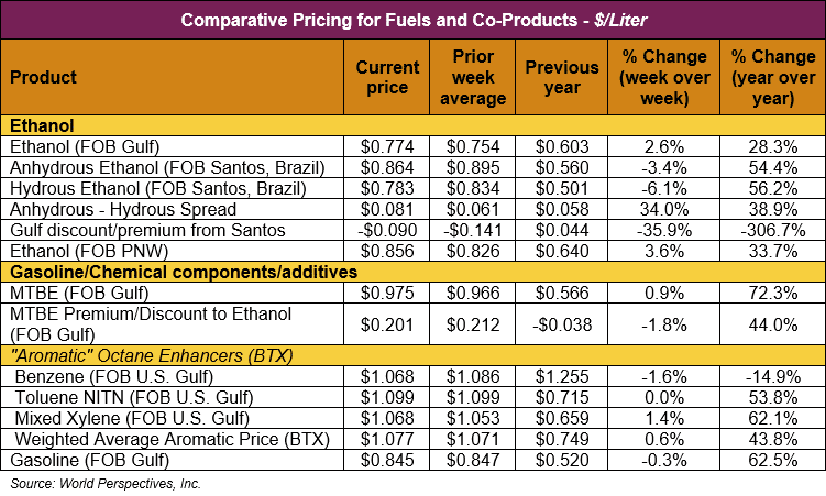 FOB Houston ethanol prices finished last week 7.2 percent higher but are down 0.4 percent through Tuesday’s trading from Friday’s close. FOB Houston ethanol prices are quoted at 77.39 cents/liter (292.97 cents/gallon). FOB Santos, Brazil anhydrous ethanol prices were higher last week; they are down in early week trading, falling 3.4 percent to 86.42 cents/liter (327.12 cents/gallon) through Tuesday’s trading.