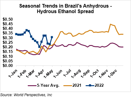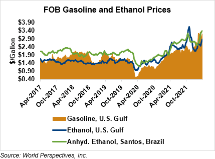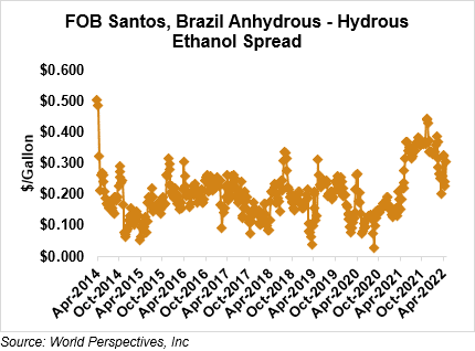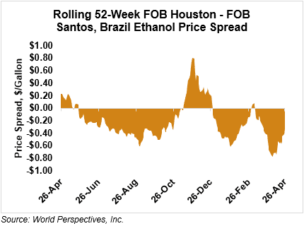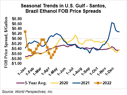 The FOB Gulf-Santos, Brazil ethanol spread has narrowed from last week’s close through Tuesday’s trading and is currently at -9.02 cents/liter (-34.15 cents/gallon).