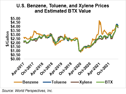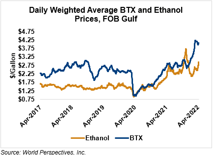 BTX component prices were mixed last week and continued that trend through Tuesday’s market close: Benzene was down 1.5 percent while Toluene was up 0 percent, and Xylene was up 1.1 percent. The estimated weighted average aromatic price is currently 107.55 cents/liter (407.1 cents/gallon), up from last Friday’s close. The BTX-Houston ethanol spread widened last week, and the weighted average BTX price is 30.15 cents/liter (114.14 cents/gallon) higher than the FOB Houston ethanol price.