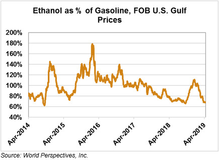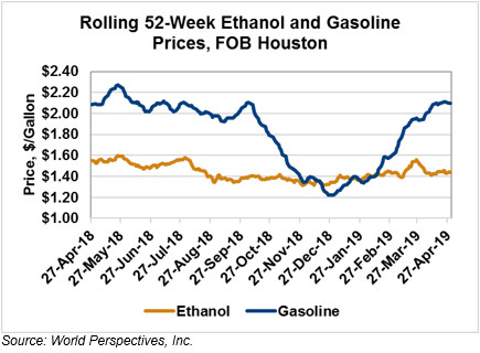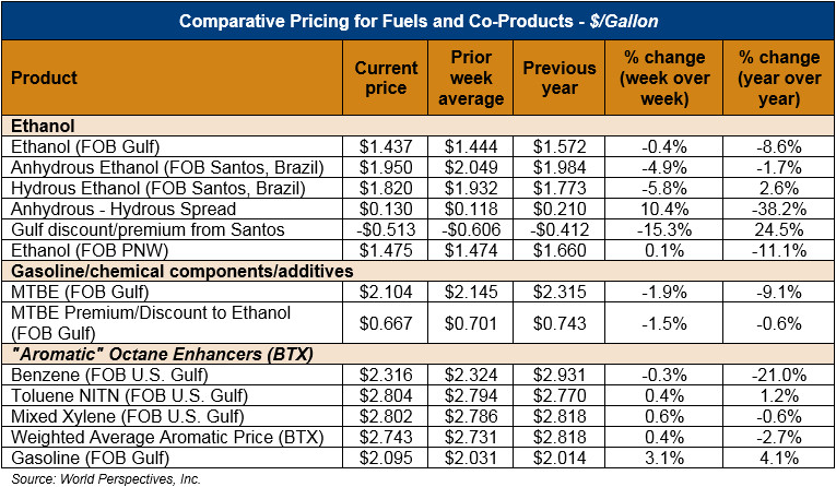 Market Outlook: U.S. ethanol prices ended last week up 0.5 percent but are down (-1.3 percent) in early week trading. Midwest wholesale rack ethanol prices were down 1 percent to end last week; they are up this week at 38.68 cents/liter (146.43 cents/gallon) through Tuesday’s trading.