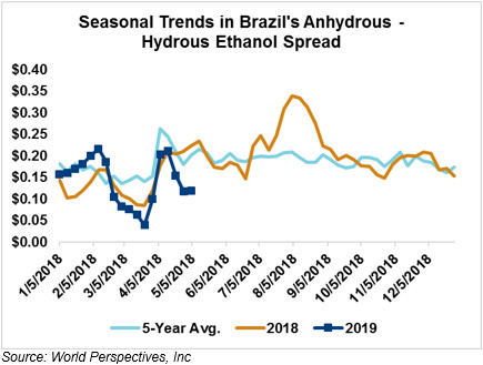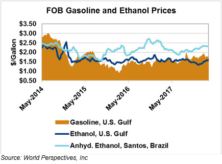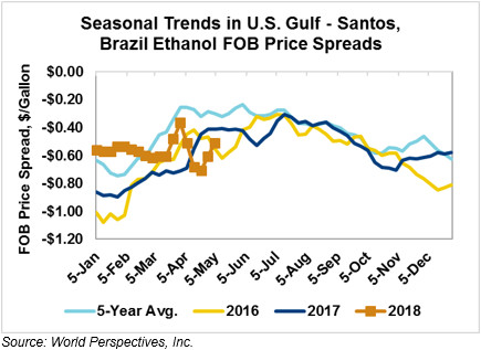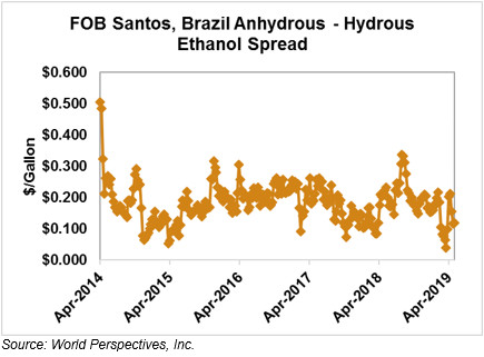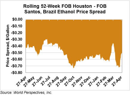 The FOB Gulf-Santos, Brazil spread narrowed significantly from last week’s close through Tuesday’s trading and is currently at -13.54 cents/liter (-51.26 cents/gallon).