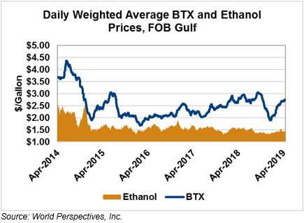 BTX component prices were up across the board to end last week and are mostly up through Tuesday’s trading: while Benzene is unchanged, Toluene is up 0.6 percent and Xylene is up 0.7 percent. The estimated weighted average aromatic price is currently 72.56 cents/liter (274.69 cents/gallon), up slightly from last Friday’s close. The BTX-Houston ethanol spread widened from last week; the weighted average BTX price is now 34.60 cents/liter (130.97 cents/gallon) higher than the FOB Houston ethanol price.