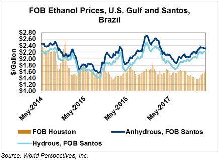 FOB Houston ethanol prices finished last week up 0.4 percent; prices are down 0.4 percent through Tuesday’s trading from Friday’s close. FOB Houston ethanol prices are quoted at 37.95 cents/liter (143.71 cents/gallon). FOB Santos, Brazil ethanol prices ended last week down 4.5 percent; they continue down 4.9 percent from Friday’s close and stand at 51.50 cents/liter (194.98) cents/gallon) through Tuesday’s trading.