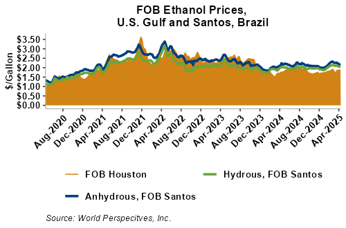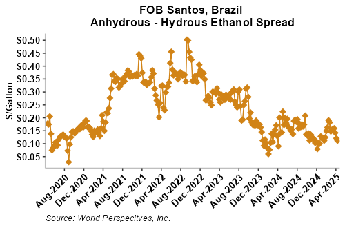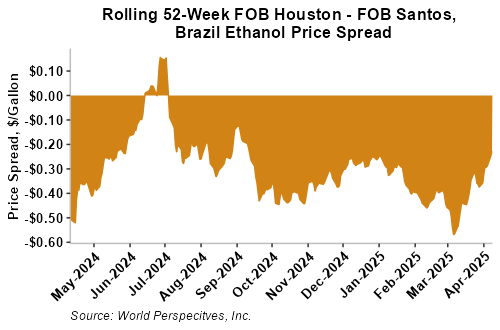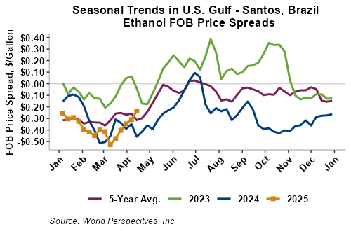 The FOB Gulf-Santos, Brazil ethanol spread has narrowed from last week’s close through Tuesday’s trading and is currently at -5.98 cents/liter (-22.63 cents/gallon).