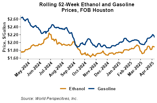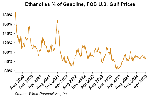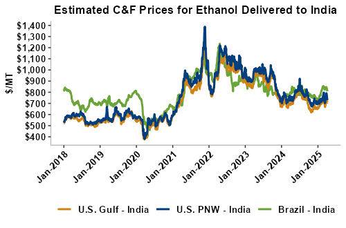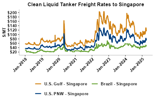 On a cost-and-freight (C&F) basis, offers are mostly higher this week as higher FOB offers for ethanol offset lower freight rates. Prices for ethanol C&F to Central America from the U.S. Gulf are up 0.7 percent this week and are up 5.6 percent from this same week in 2024. Values for PNW ethanol to Southeast Asia average $746.34/MT this week, up 2 percent from the prior week and up 6.1 percent year-over-year. That compares to U.S. Gulf to Southeast Asia C&F prices that average $733.1/MT and are up 0.5 percent from last week and are up 3.7 percent year-over-year. C&F prices for Brazilian ethanol to Southeast Asia are down 2.8 percent from last week.