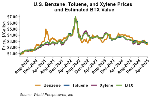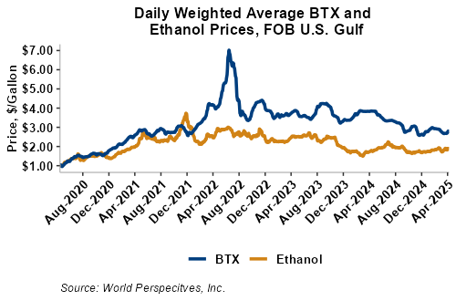 BTX component prices were higher last week but were mixed through Tuesday’s market close: Benzene was up 0.2 percent while Toluene was down 0.9 percent, and Xylene was down 0.1 percent. The estimated weighted average aromatic price is currently 72.71 cents/liter (275.23 cents/gallon), down from last Friday’s close. The BTX-Houston ethanol spread widened last week, and the weighted average BTX price is 22.87 cents/liter (86.57 cents/gallon) higher than the FOB Houston ethanol price.