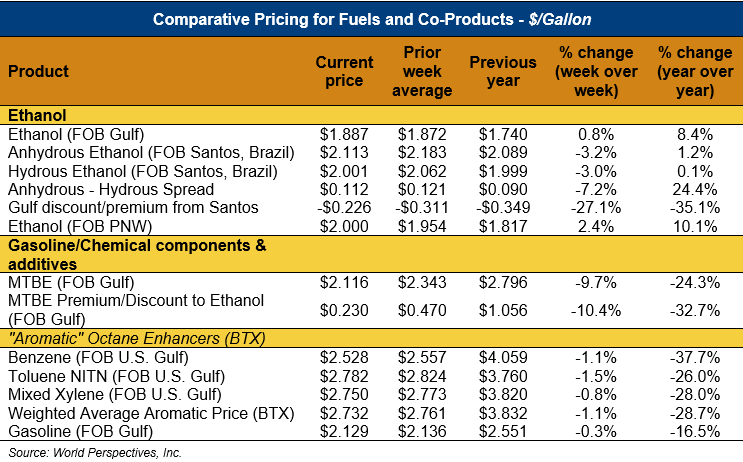 Market Outlook: U.S. ethanol prices ended last week 1.7 percent higher and extended those gains in early week trading and rose 0.6 percent through Tuesday’s close. Midwest wholesale rack ethanol prices were higher to end last week but were down 1.1 percent through Tuesday’s market close to their last quote of 50.04 cents/liter (189.44 cents/gallon).