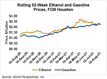 Market Outlook: U.S. ethanol prices ended last week 2.2 percent lower and are continuing that trend in early week trading, down 0.9 percent through Tuesday’s close. Midwest wholesale rack ethanol prices were lower to end last week and are down 0.3 percent through Tuesday’s market close to their last quote of 63.08 cents/liter (238.78 cents/gallon).