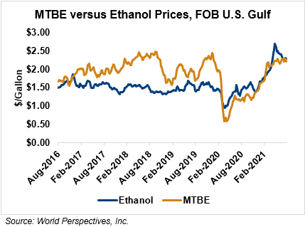 MTBE prices rose 0.4 percent last week but are reversing that trend in early week trading, down 3.1 percent from Friday’s close through Tuesday’s trading. MTBE’s premium to FOB Houston ethanol has decreased from last week’s report and stands at -1.57 cents/liter (-5.93 cents/gallon).