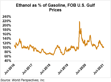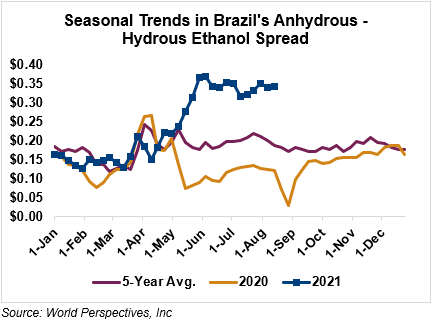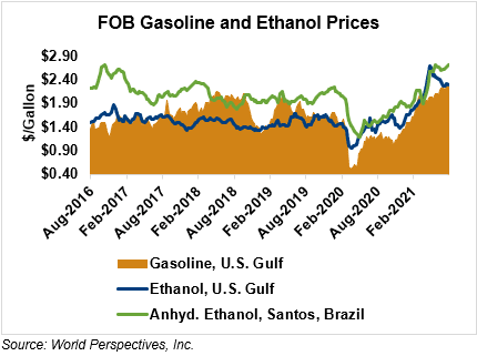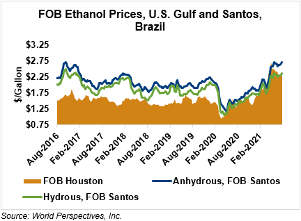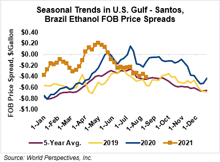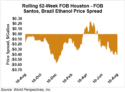 The FOB Gulf-Santos, Brazil ethanol spread has widened from last week’s close through Tuesday’s trading and is currently at -11.2 cents/liter (-42.4 cents/gallon).