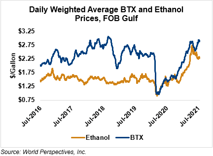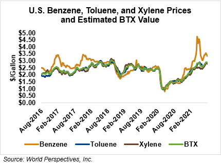 BTX component prices were mixed last week but are weaker through Tuesday’s market close: Benzene is down 1.9 percent while Toluene is down 0.6 percent, and Xylene is down 1.2 percent. The estimated weighted average aromatic price is currently 76.17 cents/liter (288.35 cents/gallon), down from last Friday’s close. The BTX-Houston ethanol spread narrowed last week, and the weighted average BTX price is 15.97 cents/liter (60.47 cents/gallon) higher than the FOB Houston ethanol price.