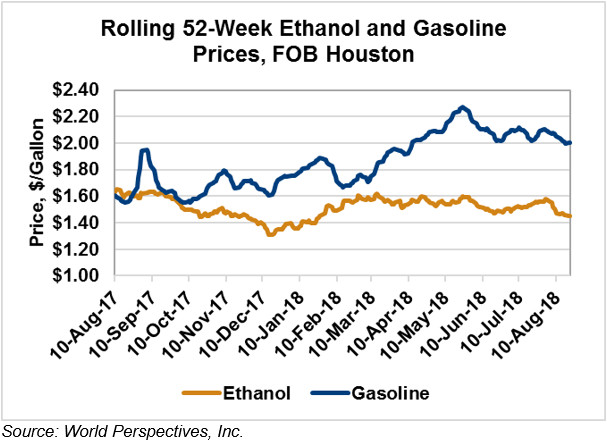 Market Outlook: U.S. ethanol prices were up slightly to end last week, recovering losses incurred following the release of USDA’s August WASDE report. This week, nearby CBOT ethanol futures are down fractionally from Friday’s close, pressured by falling corn prices. Midwest wholesale rack ethanol prices were down to end last week and are down from Friday’s close at 39.78 cents/liter (150.57 cents/gallon).