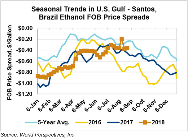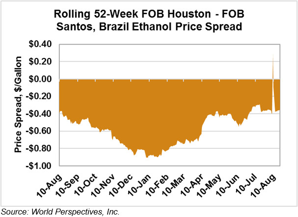 The FOB Gulf-Santos, Brazil spread has narrowed from last week’s close through Tuesday’s trading and is currently at -9.431 cents/liter (-35.700 cents/gallon).