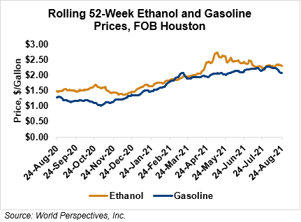 Market Outlook: U.S. ethanol prices ended last week 2.2 percent lower but were steady in early week trading and are unchanged through Tuesday’s close. Midwest wholesale rack ethanol prices were higher to end last week but are down 0.6 percent through Tuesday’s market close to their last quote of 63.81 cents/liter (241.53 cents/gallon).