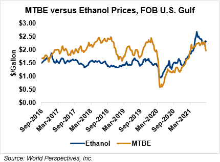 MTBE prices fell 6 percent last week and are extending those losses in early week trading, down 3.9 percent from Friday’s close through Tuesday’s trading. MTBE’s premium to FOB Houston ethanol has decreased from last week’s report and stands at -8.8 cents/liter (-33.31 cents/gallon).